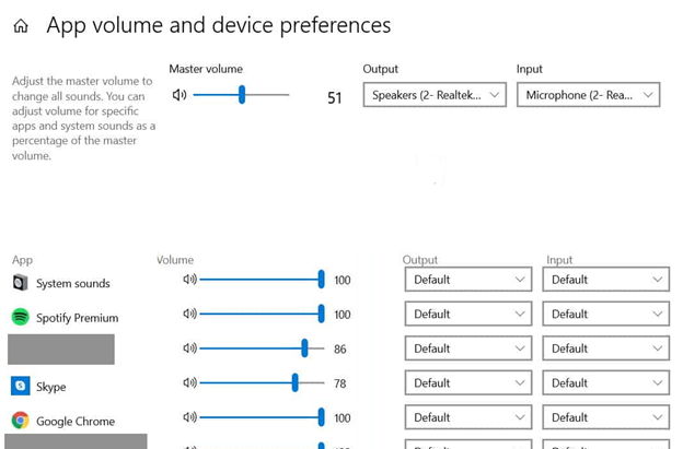 Firstly, play some music through Spotify in the background then go back to your Sound settings on windows and look at the bottom for Advanced Sound Options and then App Volume and Device Preferences.